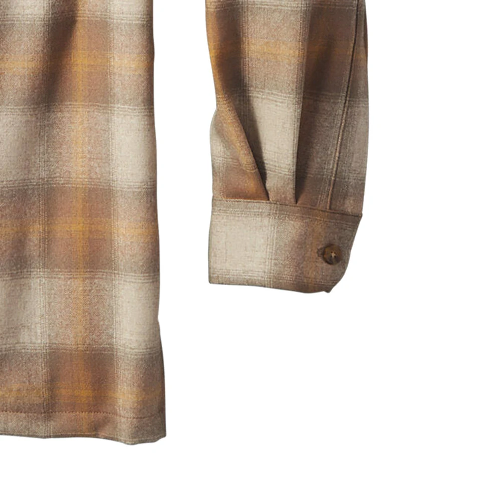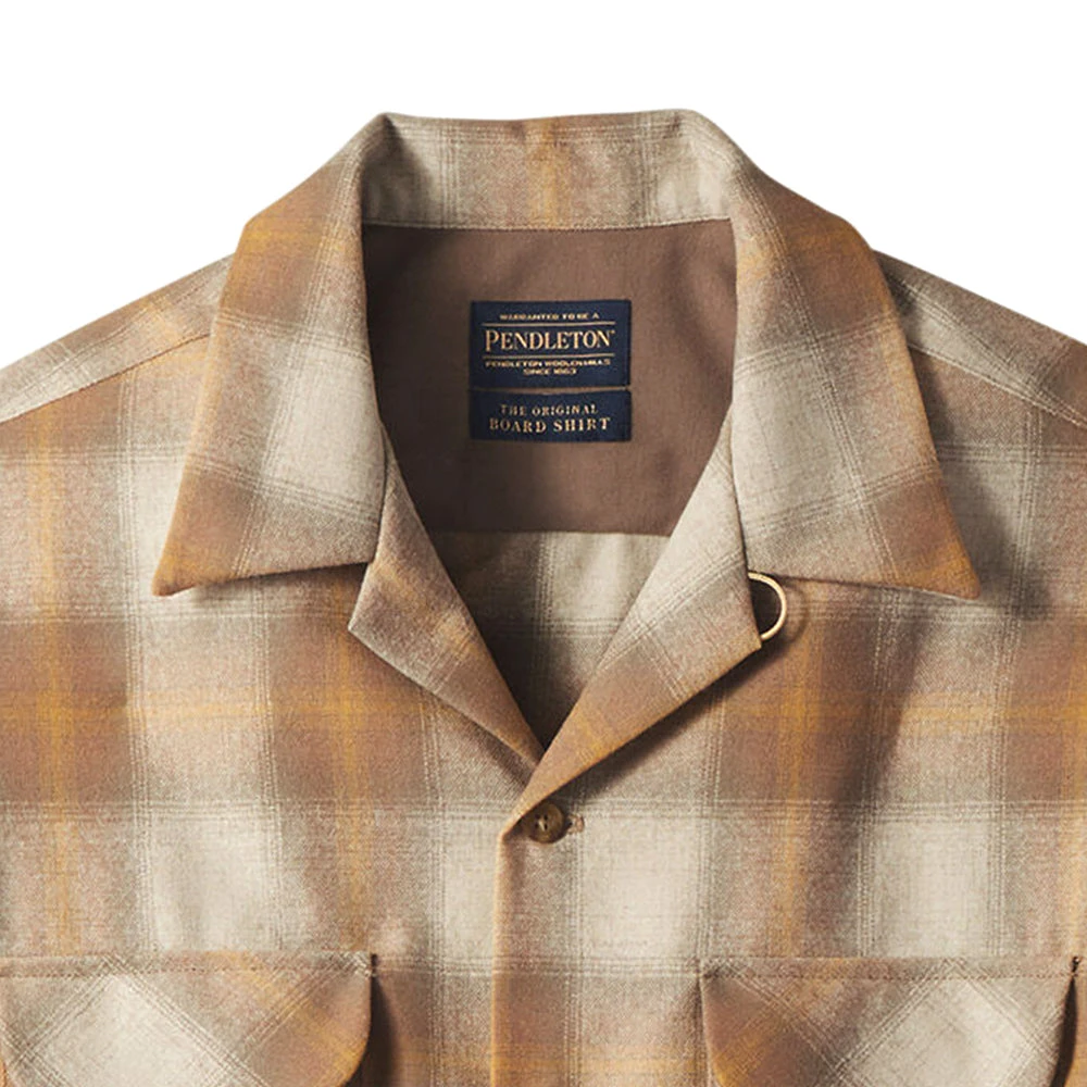 Pendleton Woolen Mills classic fit Board Shirt in Tan / Gold Plaid. Pendleton’s board shirts were made famous by the Beach Boys and these authentic surf shirts are still made from rugged, mid-weight Umatilla wool, from fleece supplied by local ranchers and woven in Pendleton’s American mills.