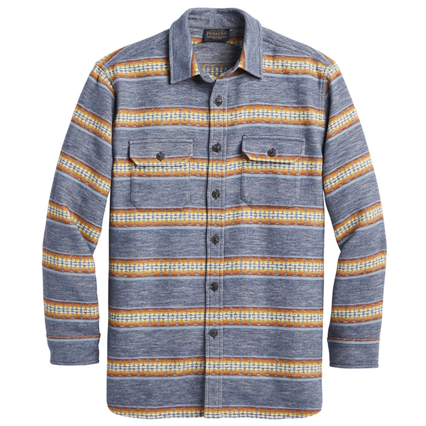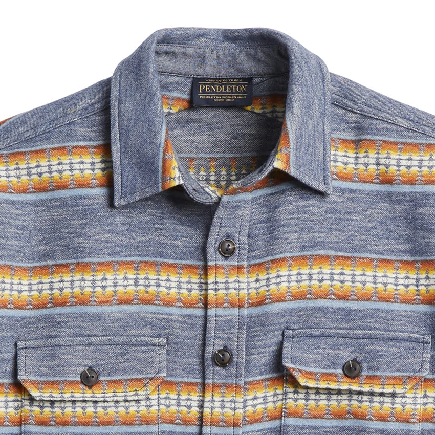 A men’s button-front shirt from Pendleton, crafted from a hefty pure cotton chamois in their Pinto Mountains pattern for a beautiful, classic Pacific Coast style. Brushed on both sides for double the softness.