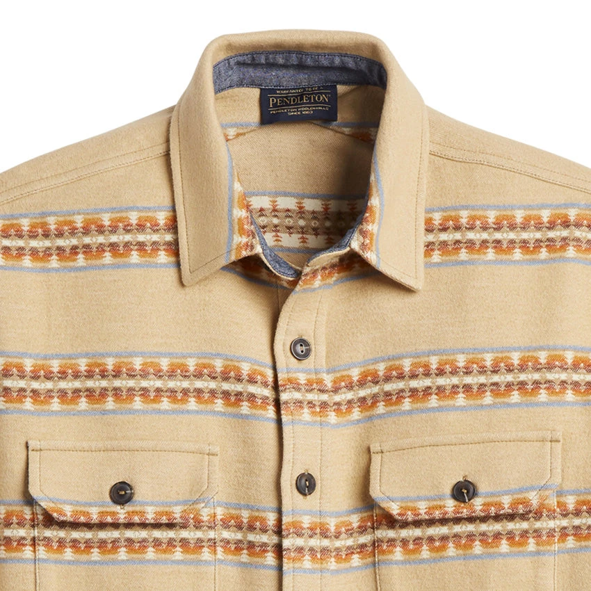 A men’s button-front shirt from Pendleton, crafted from a hefty pure cotton chamois in their Pinto Mountains pattern for a beautiful, classic Pacific Coast style. Brushed on both sides for double the softness.
