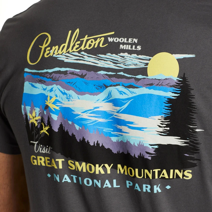 A super soft, combed cotton t-shirt from Pendleton with a vintage-inspired scene of Great Smokey Mountains National Park on the back and small Pendleton logo on the front left chest. Supreme quality and timeless style.